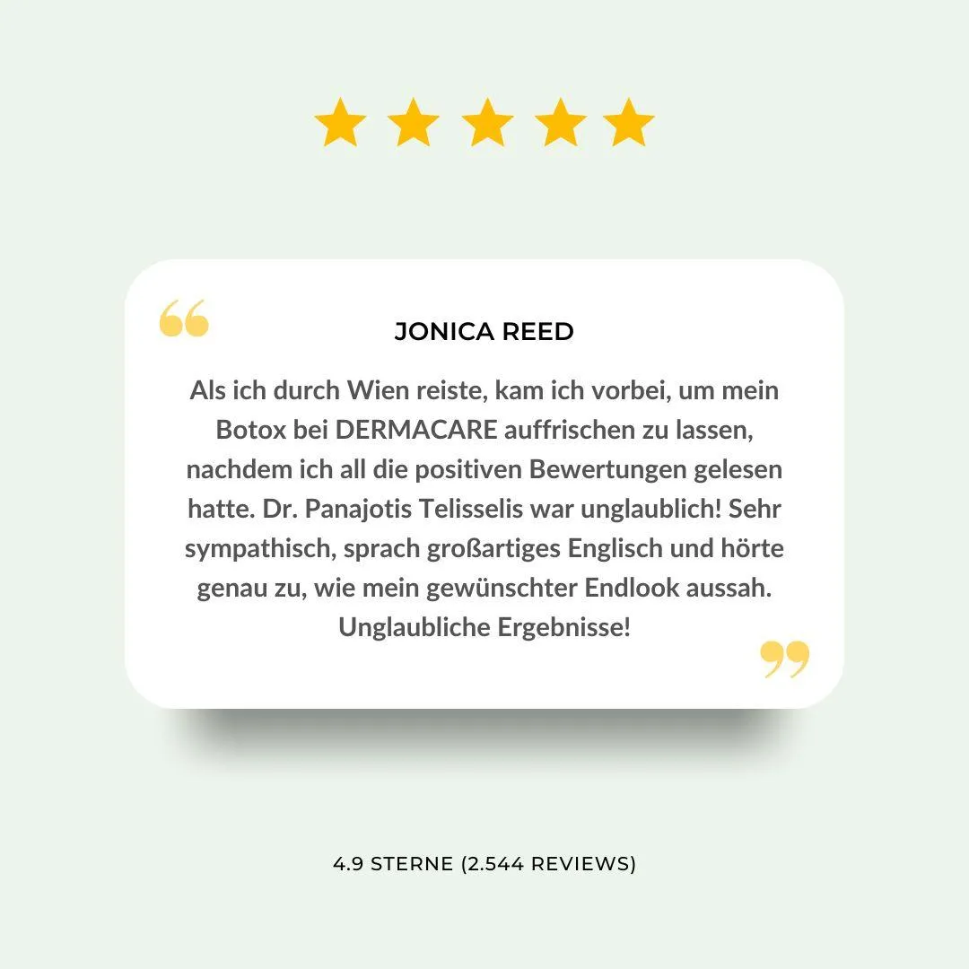 Dermacare ist einer der bekanntesten Anbieter für Botox-Behandlungen in Wien und genießt einen hervorragenden Ruf für professionelle und sichere Faltenbehandlungen. Unsere erfahrenen Fachärzte verwenden nur klinisch getestete Produkte der führenden Hersteller, um Ihnen ein natürliches und langanhaltendes Ergebnis zu bieten.